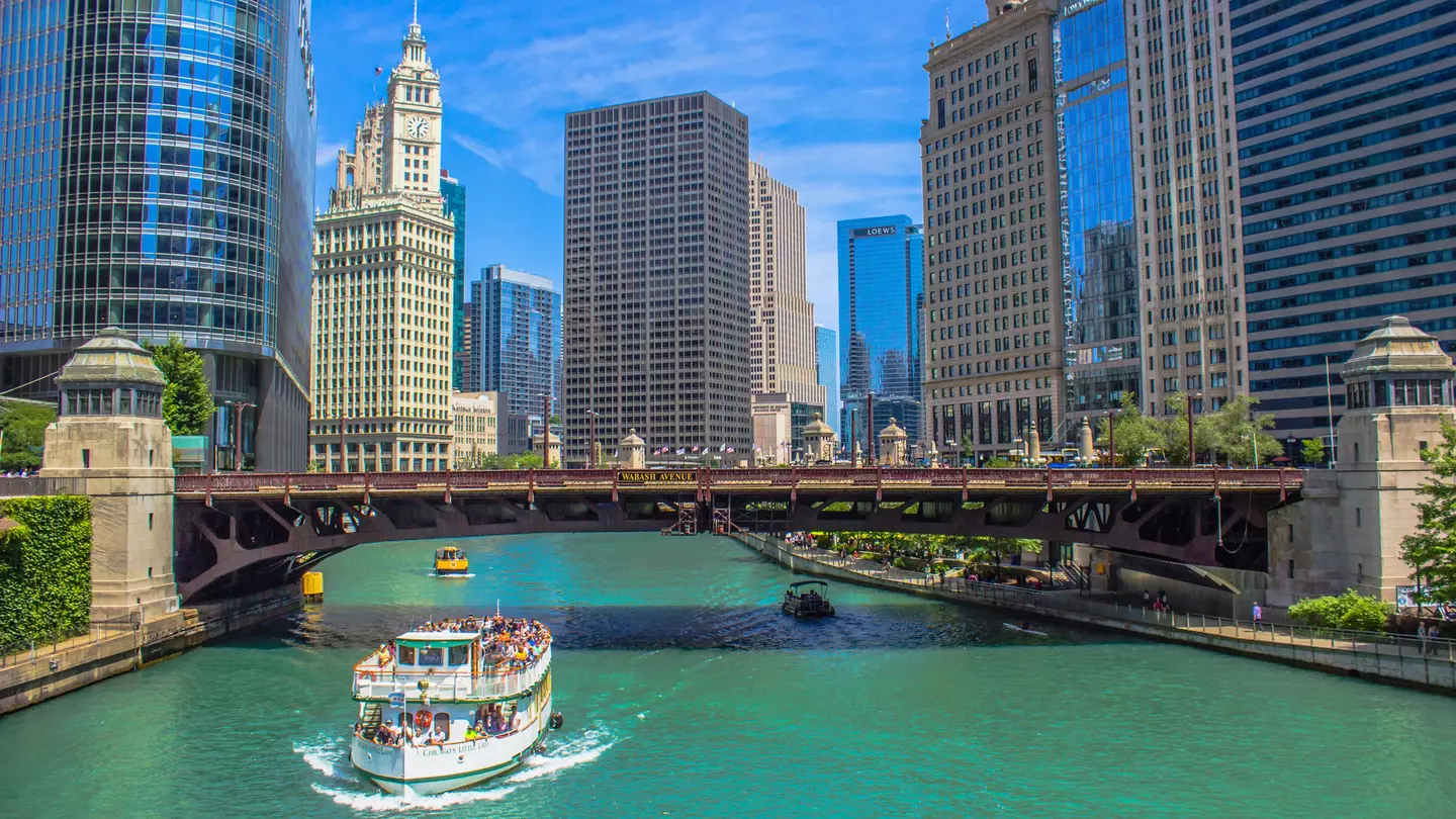 A boat on the Chicago River passes beside landmark Chicago buildings, USA.
