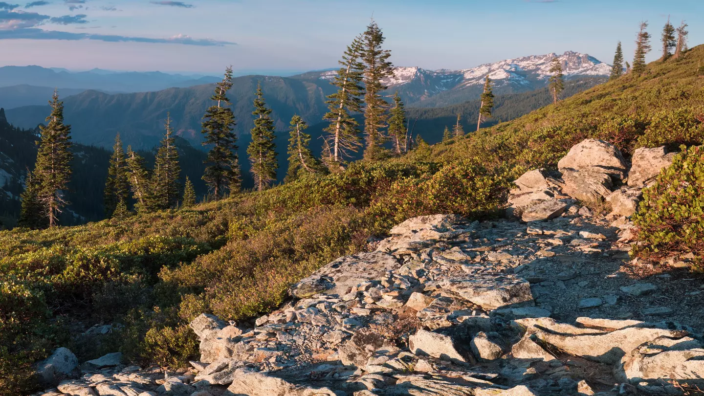 Snow-capped peaks and sunshine in Castle Crags State Park. Michal Balada/Shutterstock