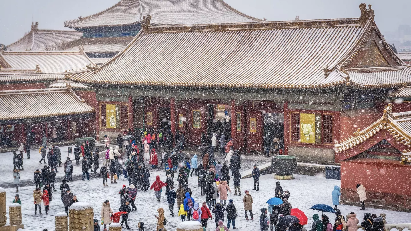 Snow falls on the Hall of Preserving Harmony, the Forbidden City, Beijing, China. Fotokon/Shutterstock